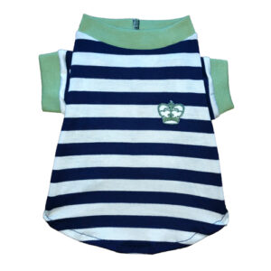 Feel like dog royalty in this striped tee with designer crown logo! Very soft and comfortable cotton lycra jersey with navy blue stripes and sage green trim on neck and sleeves. Embroidered royal crown applique with rhinestone bling completes this designer brand look