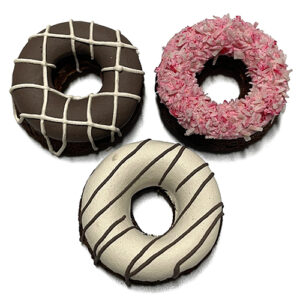 These donuts are soft (densely chewy like a day-old brownie) and made from our well-loved peanut butter apple cake recipe. A dog favorite! Each donut is individually wrapped inside the box, making serving over time no problem. Assorted.